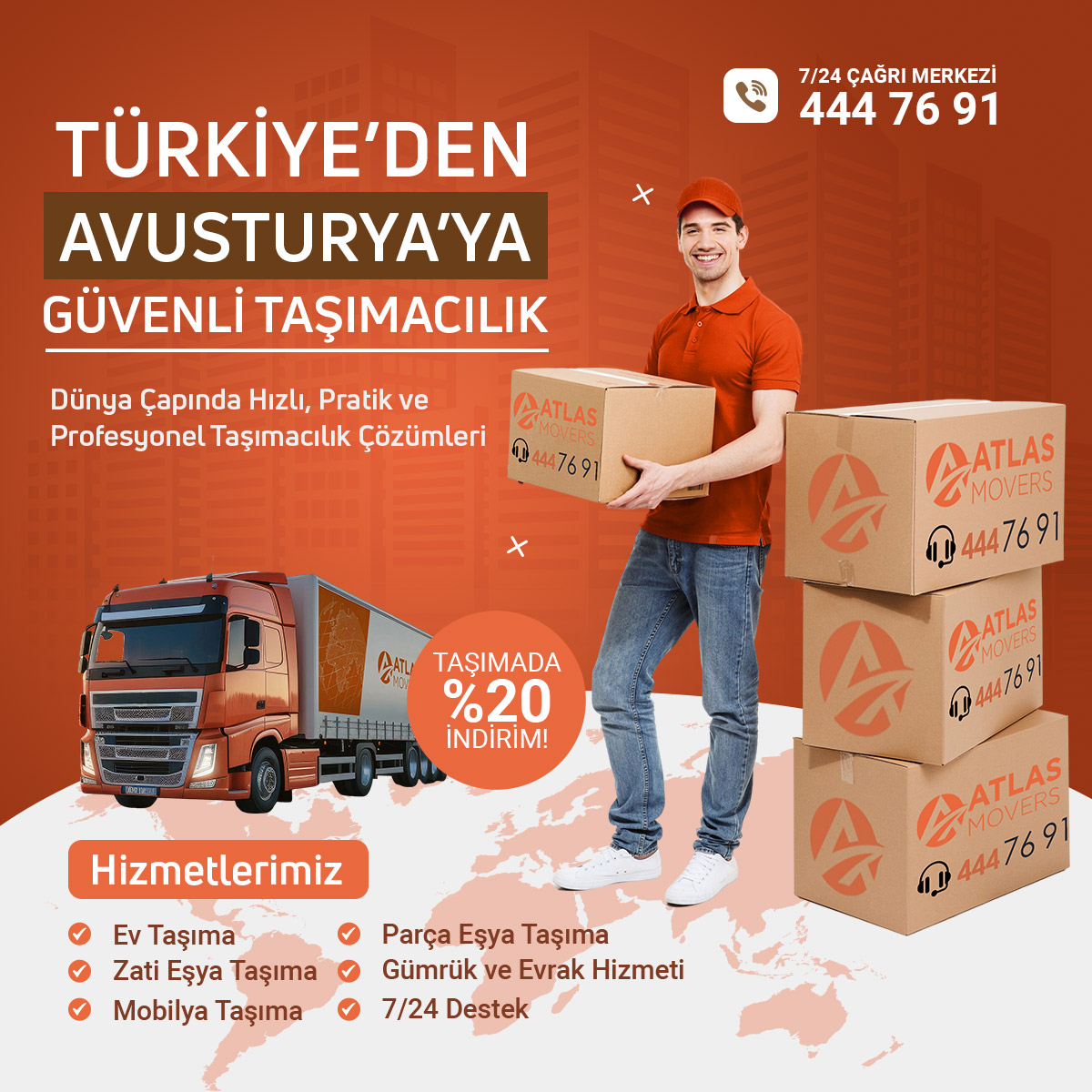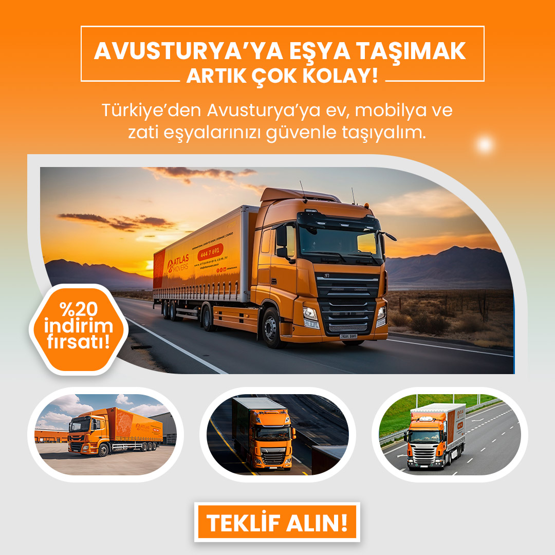 Avusturya’ya taşınırken profesyonel destek almak, tüm süreci sorunsuz ve güvenli hale getirir. Atlas Lojistik olarak, Türkiye’den Avusturya’ya ev taşıma sürecinizde yanınızdayız. Hızlı, güvenilir ve gümrük süreçlerine hakim uluslararası taşımacılık hizmetimizle; eşyalarınız zamanında ve sorunsuz şekilde yeni adresinize ulaştırılır.